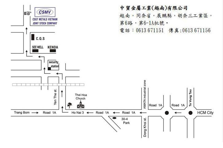 中貿金屬工業(越南)有限公司 地址:越南,同奈省,展鵬縣,胡奈三工業區,第6路,第6-1A批號‧ 電話: (+84)-613-671151 傳真: (+84)-613-671156 Email: info@csmv.vn